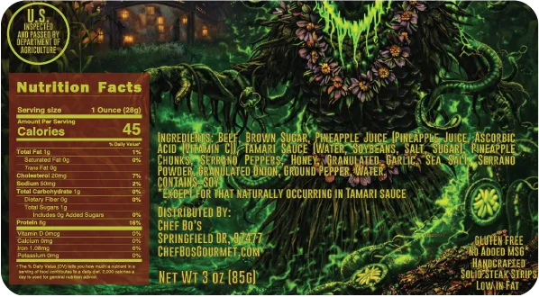 Experience a bold fusion of flavors with our Serrano Pineapple Beef Jerky. Crafted from premium, lean cuts of beef, this jerky is slow-dried to lock in tenderness and taste. The fiery kick of serrano peppers perfectly balances the sweet, tropical burst of ripe pineapple, creating a unique sweet-heat sensation that tantalizes your taste buds. Each bite delivers a smoky, savory depth with a zesty finish, making it the ultimate high-protein snack for adventurers, fitness enthusiasts, or anyone craving a gourmet twist on classic beef jerky.